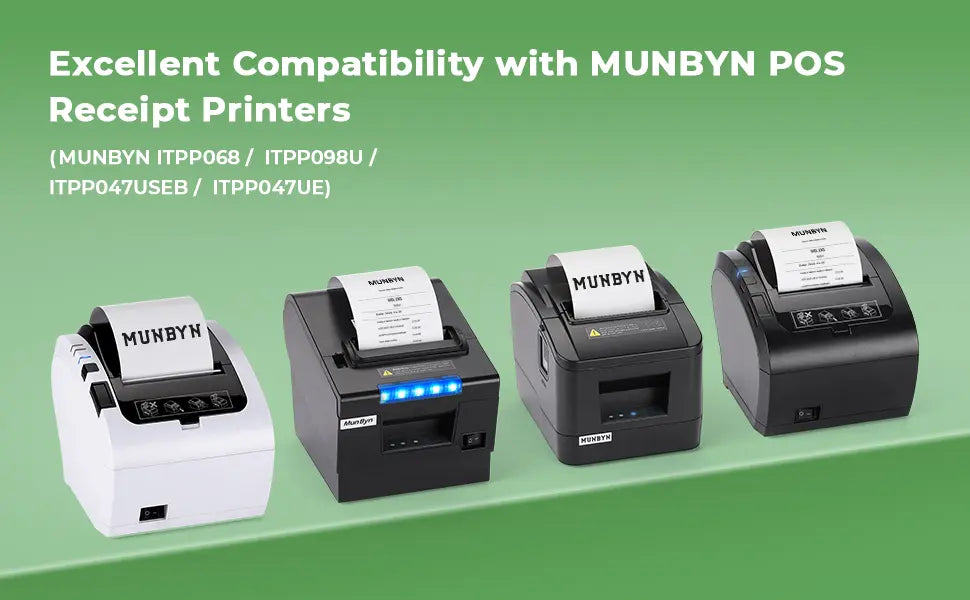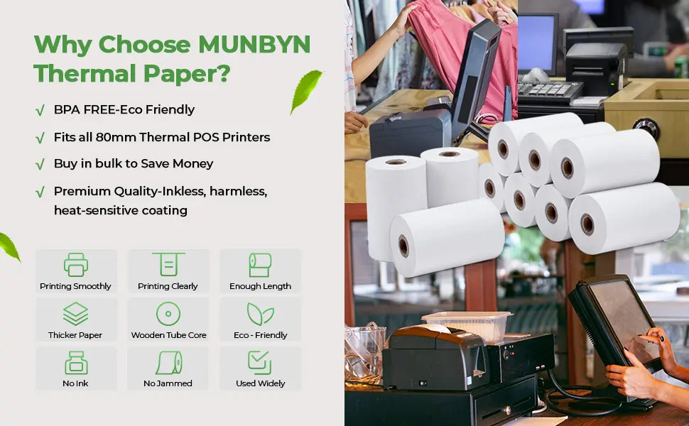 - [High quality]: High Quality MUNBYN Genuine Receipt Paper. All of our thermal paper is made of pure wood pulp without lots of scraps of paper, with durable thermal roll, to ensure smooth printing without paper jams when using the receipt printer.
