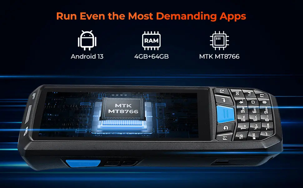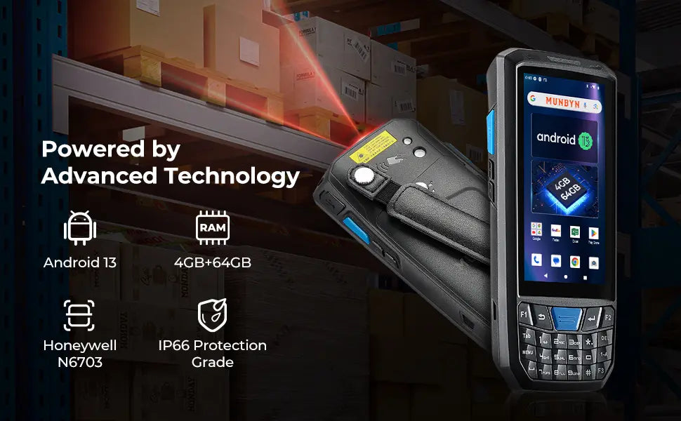 - [Lightning-Fast Performance] Featuring 4GB+64GB storage, MUNBYN 035Pro android scanner ensures smooth multitasking and ample space for data and apps. The MediaTek MTK MT6765 quad-core processor offers excellent performance and stability, making warehouse operations more efficient. This PDA device handles goods receiving, shipping, and inventory management with ease.