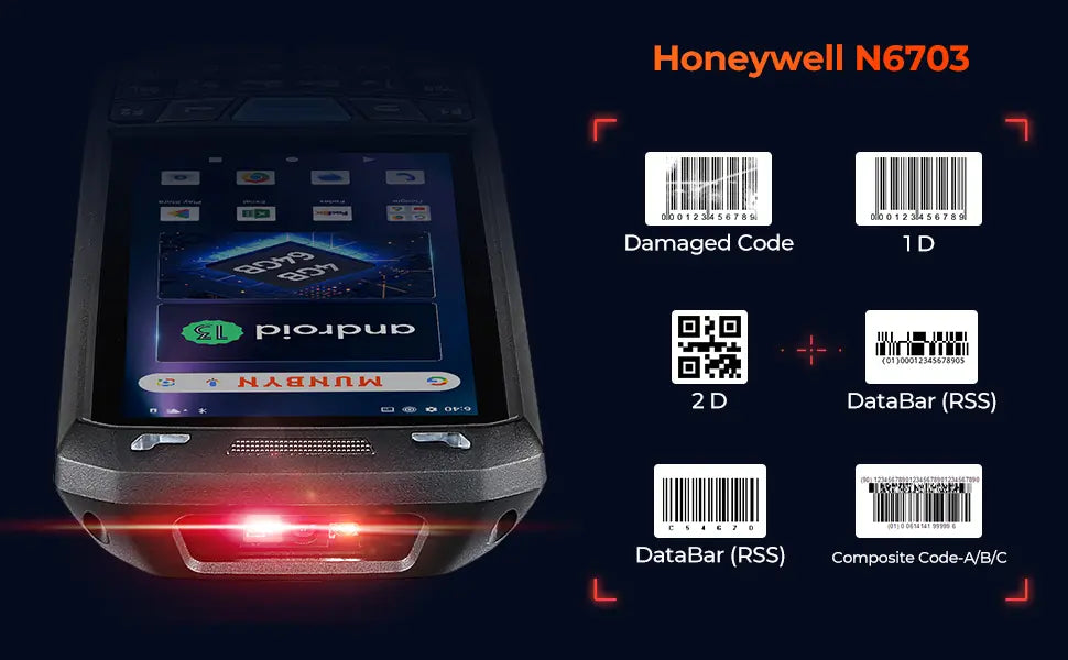 - [Enhanced Scanning Performance] With the Honeywell N6703 scan engine, the MUNBYN 035Pro PDA scanner excels in inventory tasks. It reads Code 39 (20 mil) at 0.8 m (31.5 in) and offers a 40% greater read range than its predecessor. Its compact, low-power design is ideal for handheld use, and its robust build ensures durability in tough environments. Perfect for fast, accurate scanning in high-movement scenarios, this android pda boosts efficiency in logistics, retail, and industrial applications.