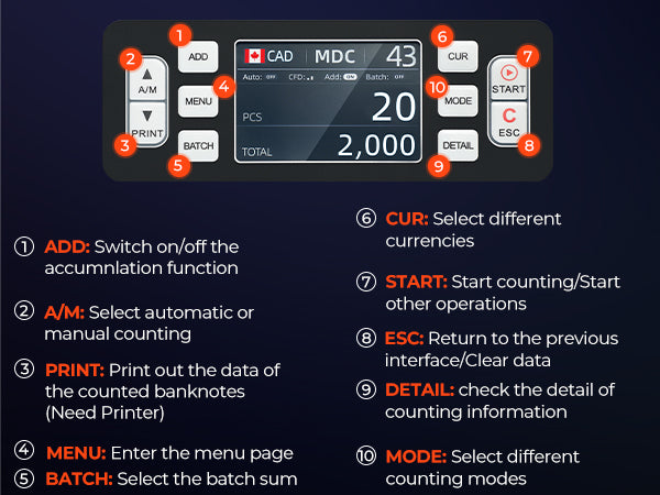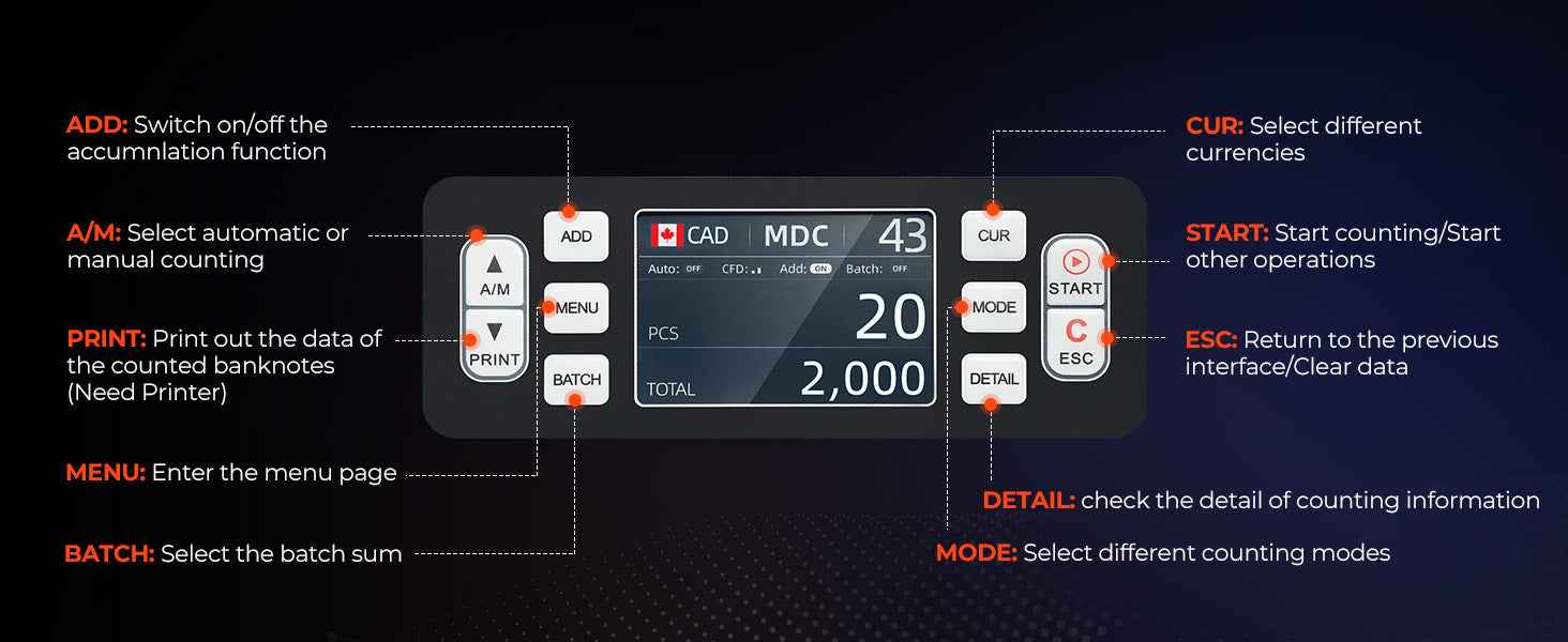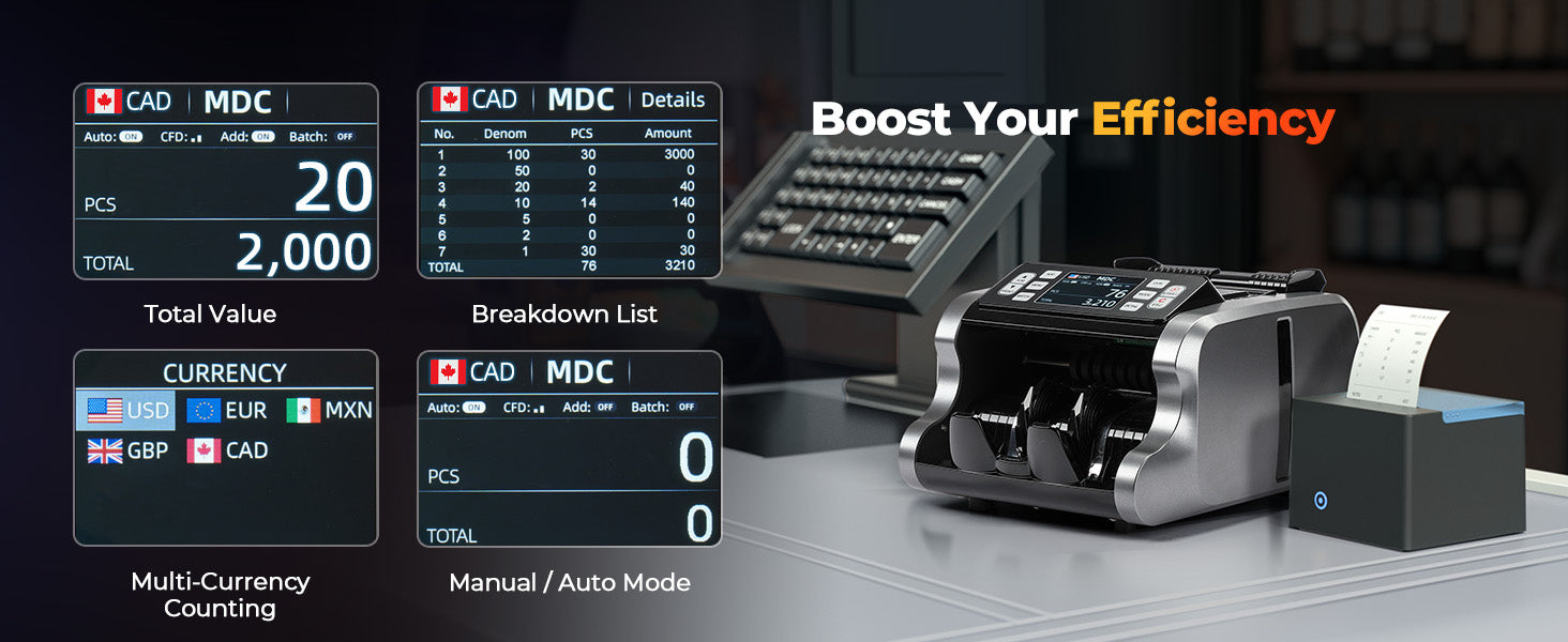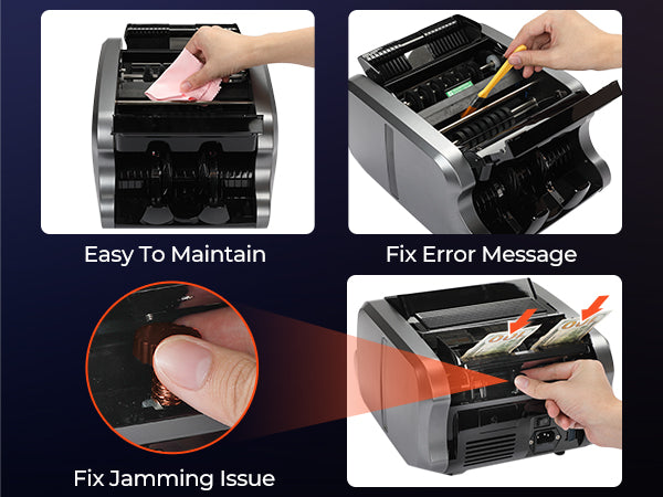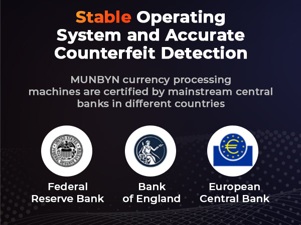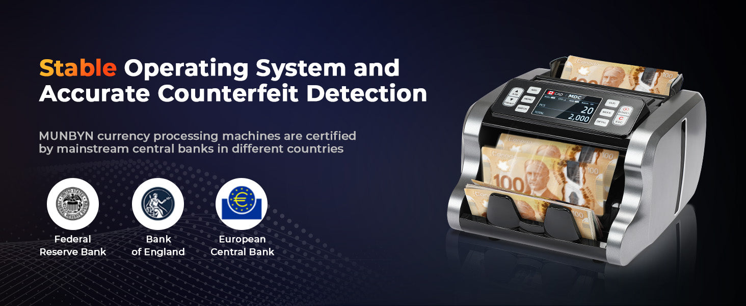 - [Bank-Grade Counterfeit Detection] With 2 special Infrared Detection tubes, our money counting machine uses UV/IR/MG/MT detecting technology to examine the bills. Using Magnetic, Infrared, Ultraviolet, Dimensional, Thickness, Security Line, Variable Ink, Spectrum, and Fluorescence Detection techniques to completely protect your company from false bills