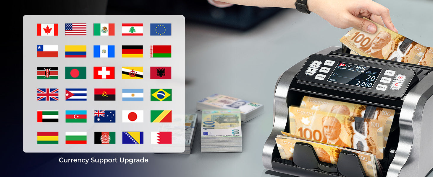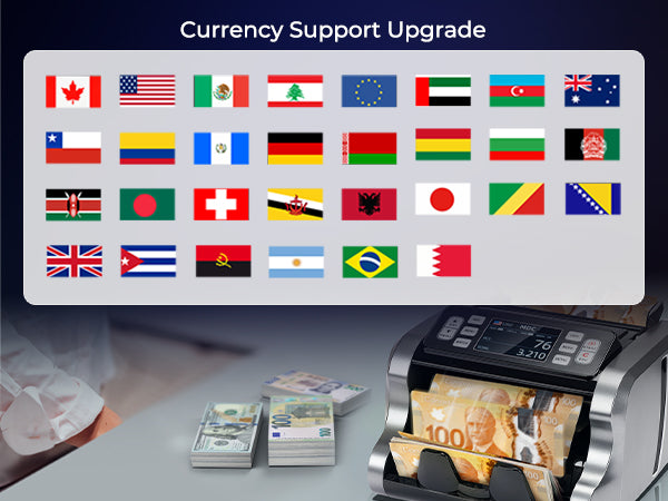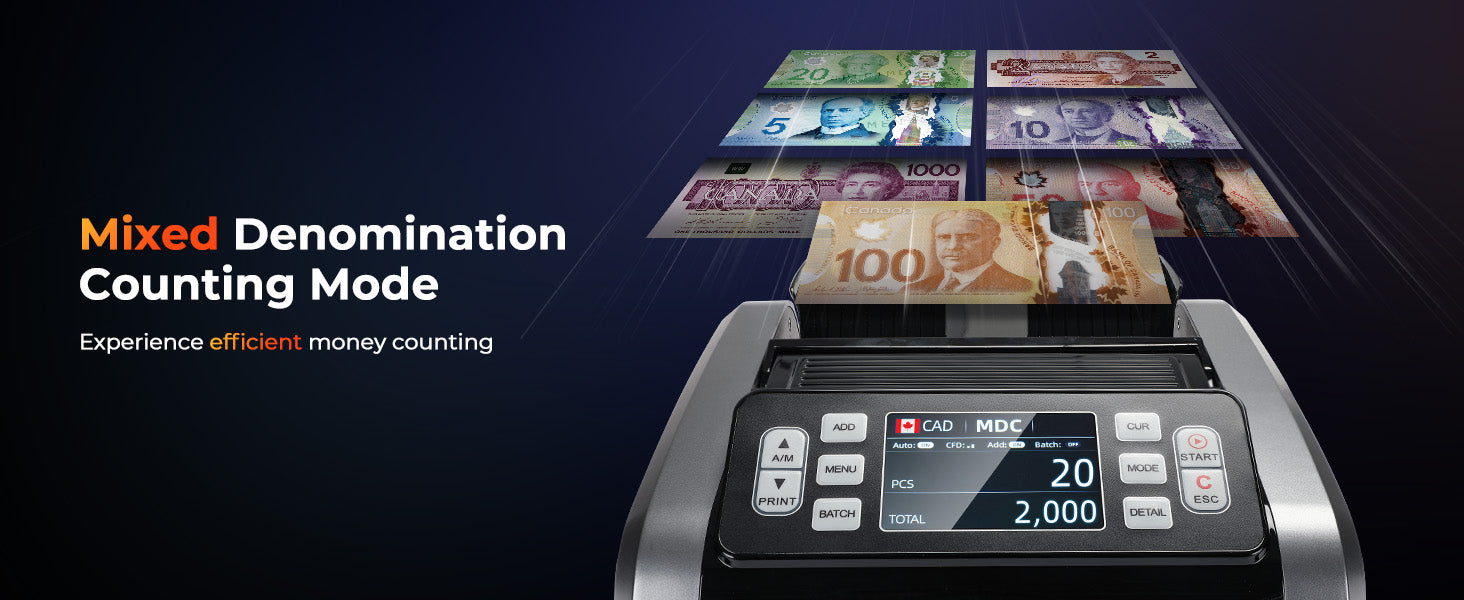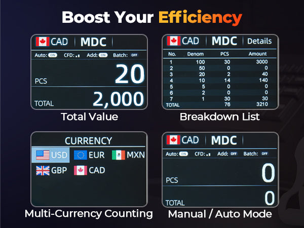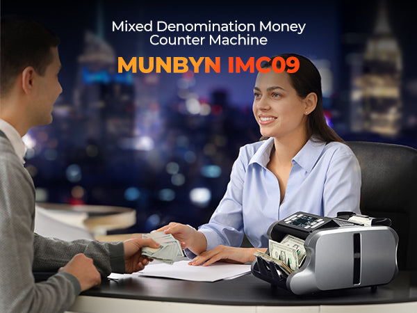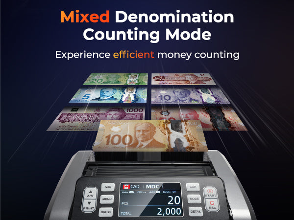 - [Mixed Denomination&Multi Currency] Just put your money into the machine and turn to Mixed Denomination Counting mode(MDC mode), this mixed denomination money counter machine will give you the value and quantity of the bills. Besides, IMC09 supports multi-currency value counting(USD/MXN/CAD/EUR/etc) and is equipped with a 3.5” TFT display screen